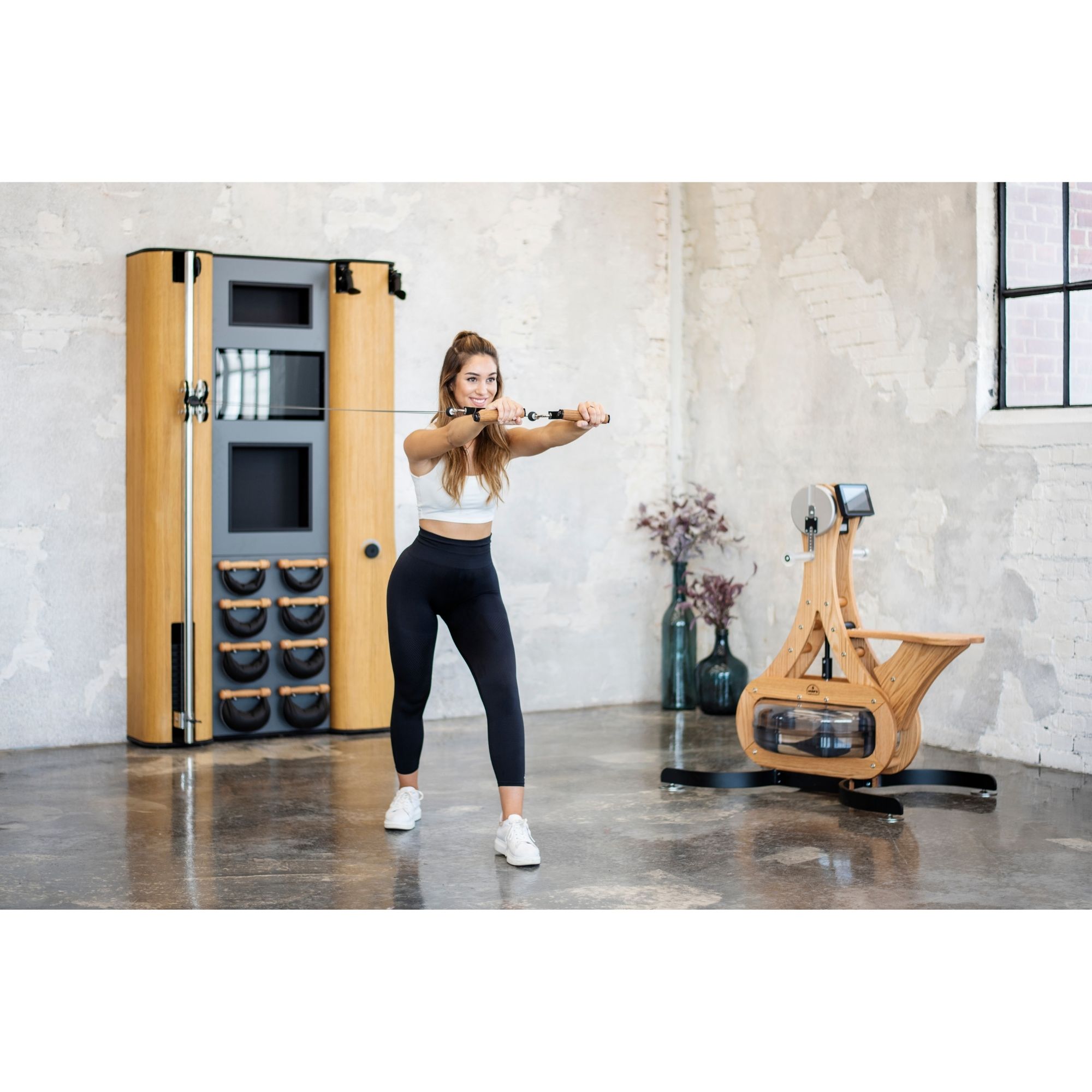 Le module Slimbeam Machine Un module à câble avec un système de poulie universelle à double tirage doté de plaques de charge pour assurer la résistance . Objectif : Réaliser des exercices de musculation et de functionnal training. Le module Ski Trainer Un module qui développera votre force et votre endurance. Objectif : Solliciter les muscles des membres supérieurs, inférieurs et du tronc. Le rythme et la vitesse. Il s’adaptera à tous les sportifs. Set d’haltères Pour la réalisation d’exercices de musculation un set d’haltères SwingBell est inclus.