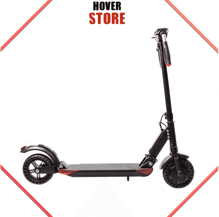 La trottinette est montée sur des roues de 8 pouces, et est équipée de suspensions pour absorber les chocs dus à la chaussée.
